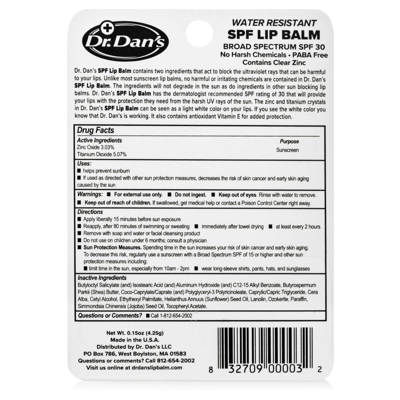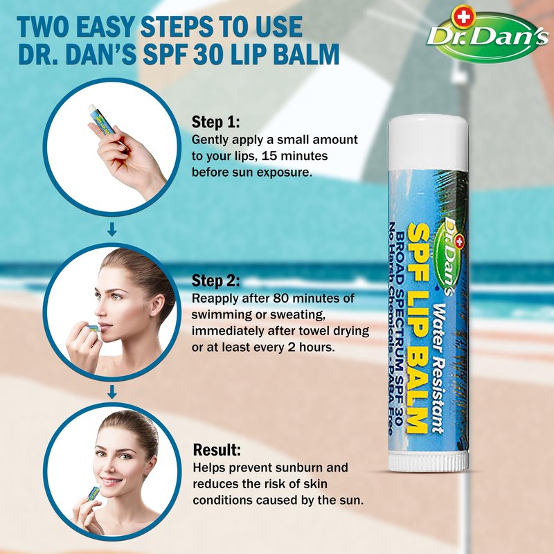 - Dr. Dan’s SunBlock SPF30 protects your lips and helps to keep them soft all at the same time.