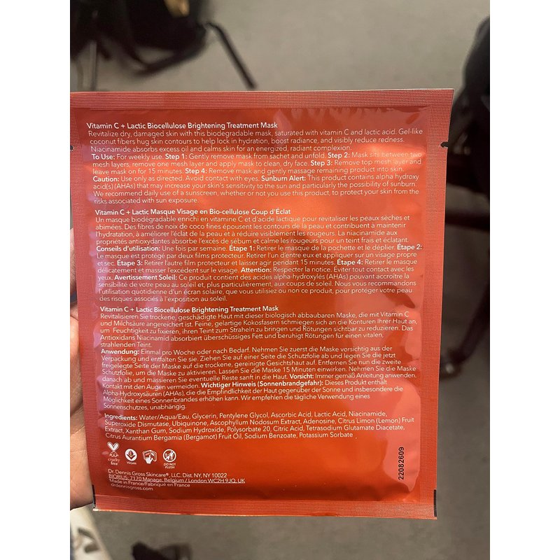 - BRING THE DERMATOLOGIST OFFICE HOME: Revive dry, visibly damaged skin with this biocellulose mask saturated with vitamin C and combined with lactic acid for increased absorption and enhanced performance. Biodegradable, gel-like coconut fibers hug skin contours to help lock in hydration, boost radiance, and reduce redness. Antioxidant niacinamide absorbs excess oil and calms redness for an energized, radiant complexion.