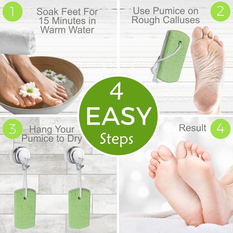 - EFFORTLESS USAGE: Simply soak feet in warm water for 15 minutes, then use the pumice stone to scrape off the dry callused skin around your heels or other targeted areas. Hang your pumice to dry in the shower and you're done!