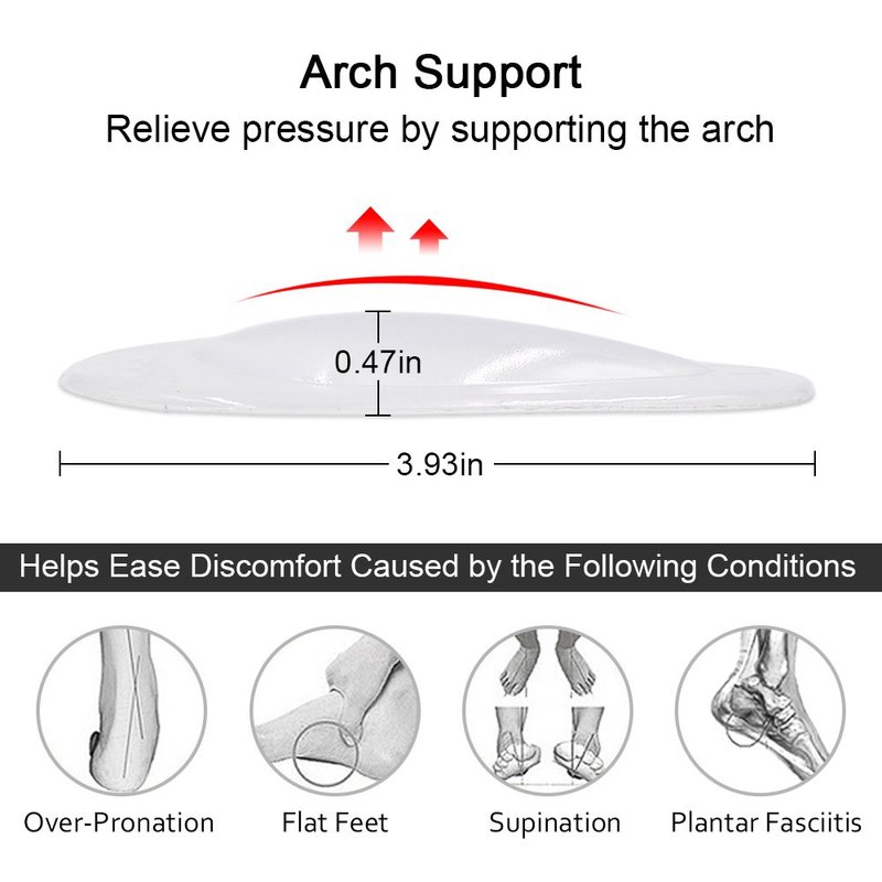- MATERIAL: Made of durable and soft PU gel material, it is very comfortable and elastic for those who has arch problem. Strong stickness bottom layer fixes insole position, it is suitable for sandals, high heels.