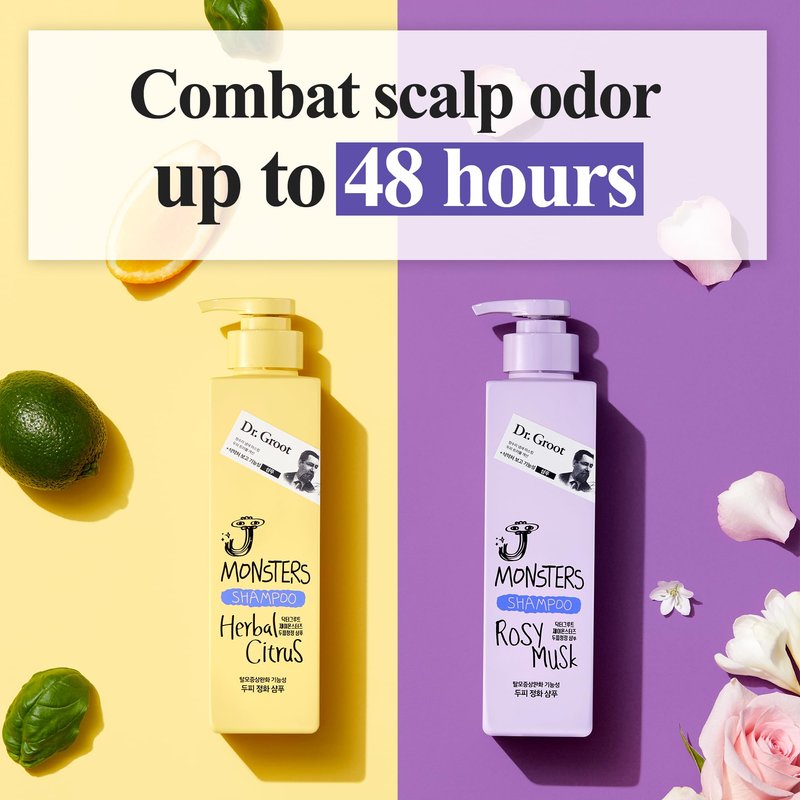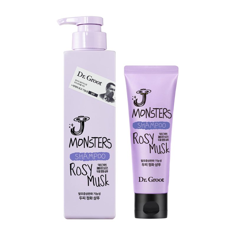 - DR. GROOT J MONSTERS SHAMPOO SET (400ml/13.5fl oz + 75ml/2.5fl oz) - Crafted with a unique blend of sea salt and volcanic ash, this set purifies to eliminate buildup and impurities for a fresh, clean feel. J Monsters hair products are available in 2 exquisite scents - refreshing herbal citrus and powdery rosy musk.