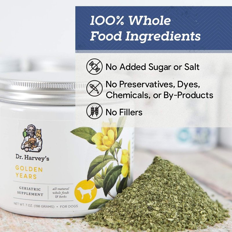 Dr. Harvey’s Golden Years is an herbal whole food supplement specially formulated for senior dogs. This powdered supplement is a combination of nutritious whole foods and herbs that have been known to help the body to maintain its ability to fight disease and may help to increase longevity.