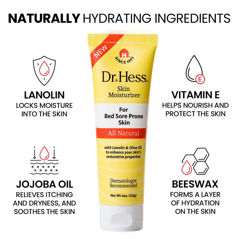 - Intense Hydration: Our Dr Hess Skin Moisturizer is formulated with key ingredients such as Lanolin, Beeswax, Jojoba Oil, and Vitamin E to lock in existing moisture, absorb additional moisture from the air, and provide necessary antioxidants for deep healing; Ideal for dry, damaged, and bed sore prone skin