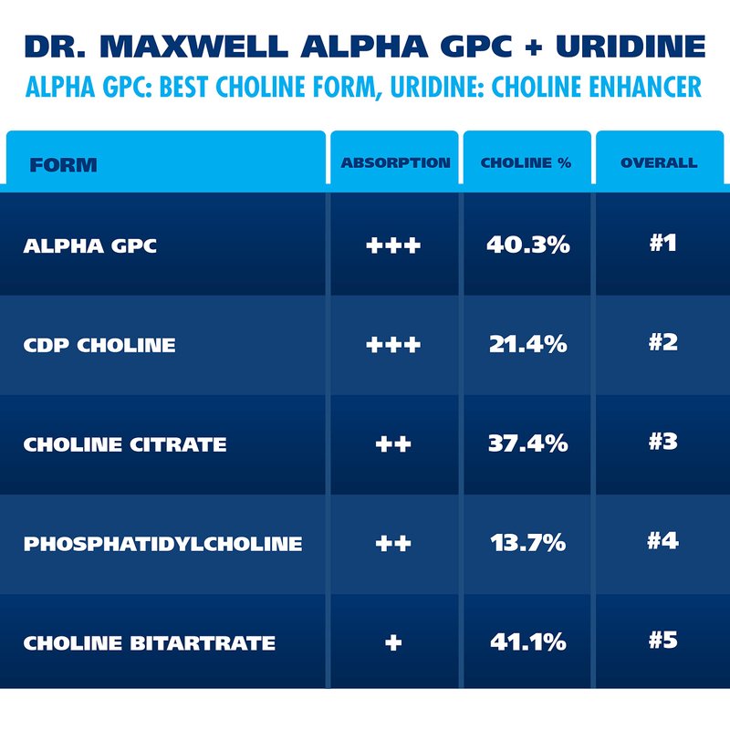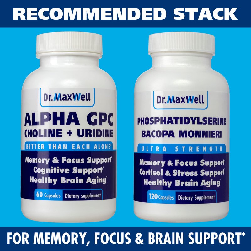 Dr. Maxwell Alpha GPC 600mg + Uridine, a Choline Enhancer. Better Than Alpha-GPC or Uridine Alone. Best Alpha GPC Choline: 2in1, Soy Free, No Fillers, USA, 60 Pills, Acetylcholine Precursor