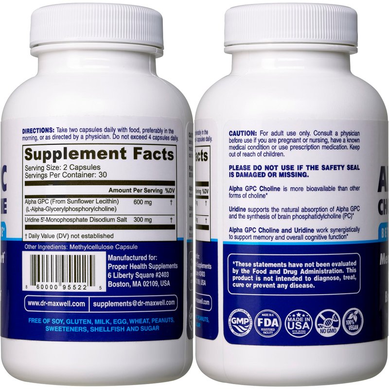 Better than Alpha GPC or Uridine аlone. Do you know that Uridine increases the absorption of Alpha GPC Choline and the two work synergistically to support memory and overall cognitive function? Taking Alpha GPC and Uridine together works better than each on its own* Alpha GPC is the most bioavailable form of Choline. Choline sources differ in terms of choline content and absorption. The two most easily absorbed forms are Alpha GPC and CDP Choline, but Alpha GPC has double the choline content of CDP Choline (40.3% vs. 21.4%). PhosphatidylCholine and Choline Citrate have poorer absorption and lower choline content (13.7% and 37.4%)* Do you know that it is important to choose soy free Alpha GPC even if you don’t mind soy? Alpha GPC can be derived from lecithin from sunflowers or soy. The extraction process from sunflowers involves cold press, while the extraction process from soy involves chemicals. This is why, unlike leading alternatives, we provide soy free Alpha GPC from sunflower lecithin* Great choice without inactive ingredients other than a vegetable capsule. At Dr. Maxwell we are concerned with maximum wellness so we avoid the unnecessary inactive ingredients others put in their formulas: silicon dioxide, stearic acid, magnesium stearate, starch, etc.* Two synergistic ingredients at the price of one. Get the two ingredients Alpha GPC Choline and Uridine Monophosphate at the price of only one with Dr. Maxwell, saving at least 18$* Made in the USA from the highest quality, non-GMO, pure, vegan ingredients in a cGMP and FDA-registered facility. Free from soy, gluten, milk, eggs, wheat, peanuts, sweeteners, shellfish and sugar.