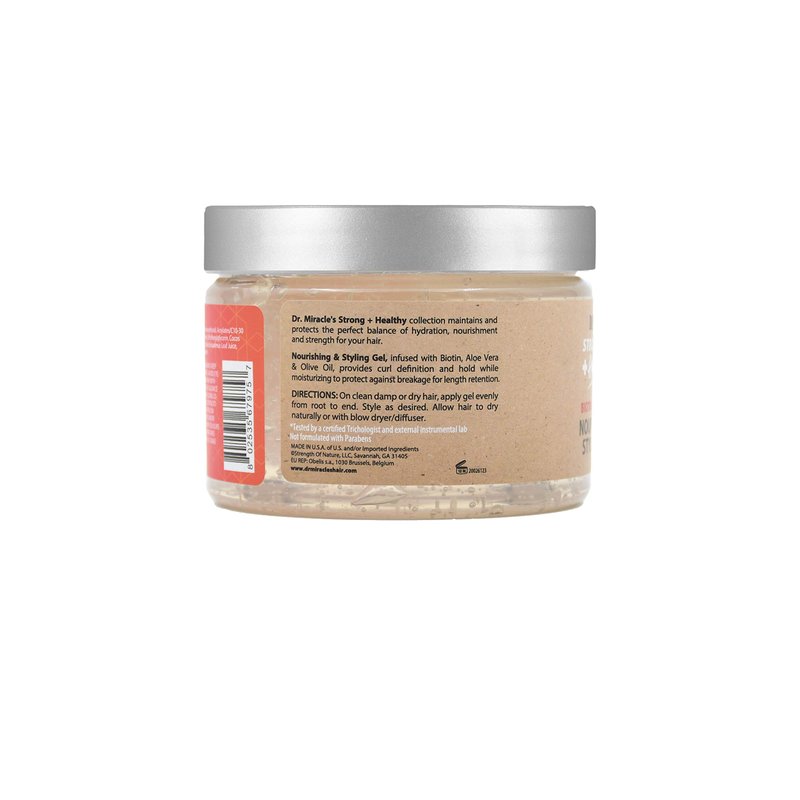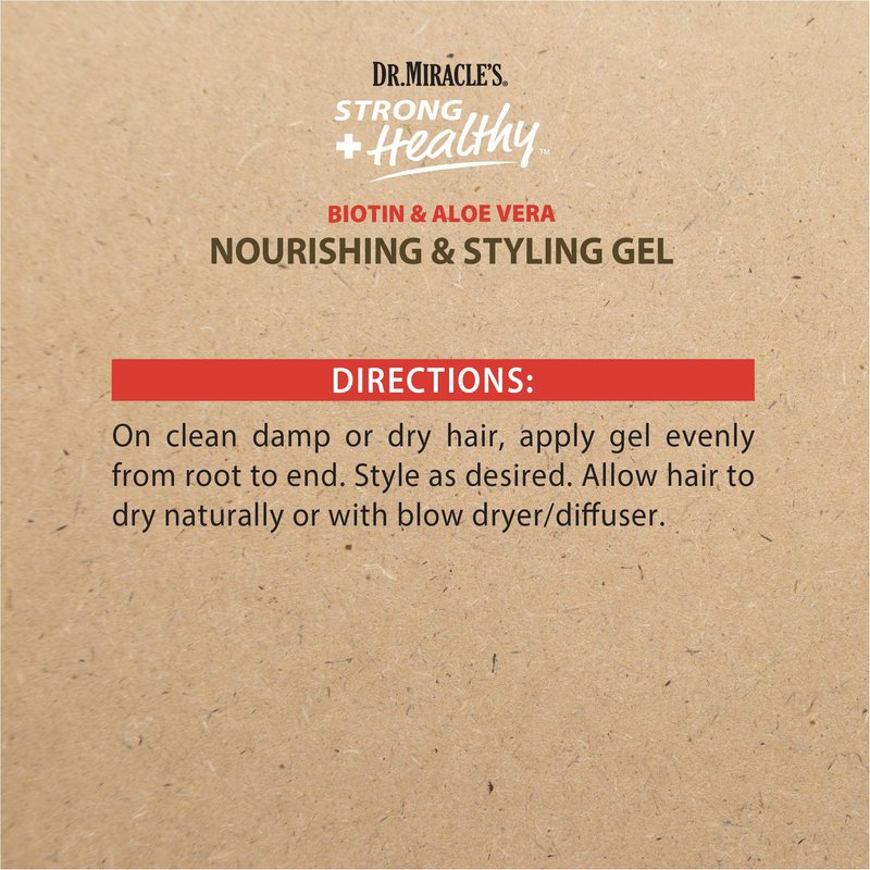 Dr. Miracle's Strong & Healthy Nourishing & Styling Gel. Contains Aloe Vera and Olive Oil to moisturize hair and reduce irritation.