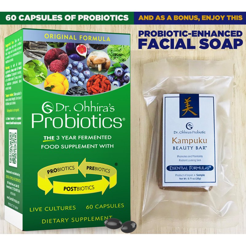 - PROBIOTICS FOR YOUR GUT AND SKIN: Included in your purchase is a 60 count box of Dr. Ohhira's Original Formula Probiotics and also a TRIAL-size of the award-winning Dr Ohhira Kampuku Beauty Bar that contains probiotics for your skin.