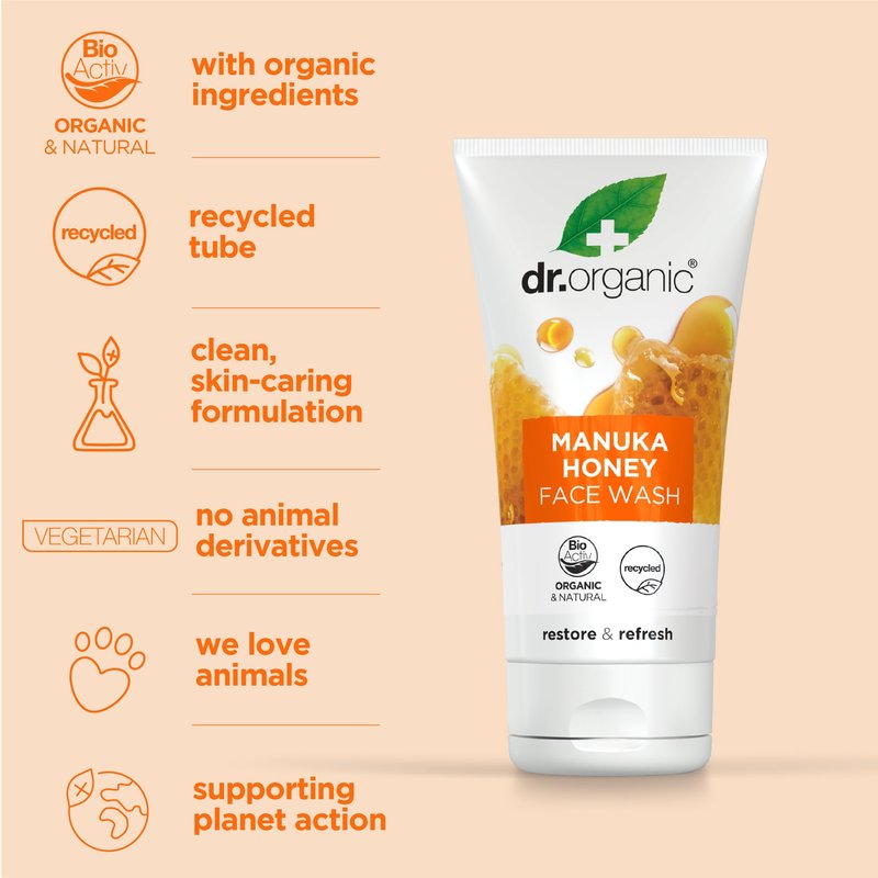Dr. Organic Manuka Honey Face Wash | Gentle, Soothing, Cleansing, For Dry and Sensitive Skin, Certified Organic, Paraben & SLS-Free, Natural, 150 mL / 5 fl oz