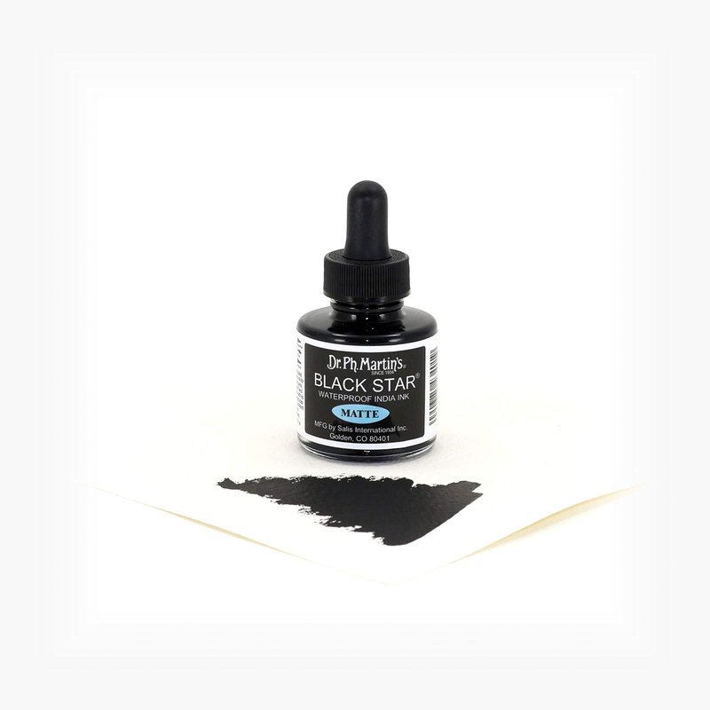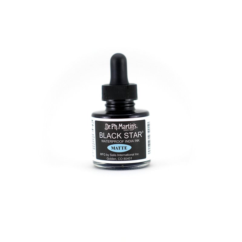 - Black Star Matte India Ink in a 1.0 oz glass bottle with dropper
