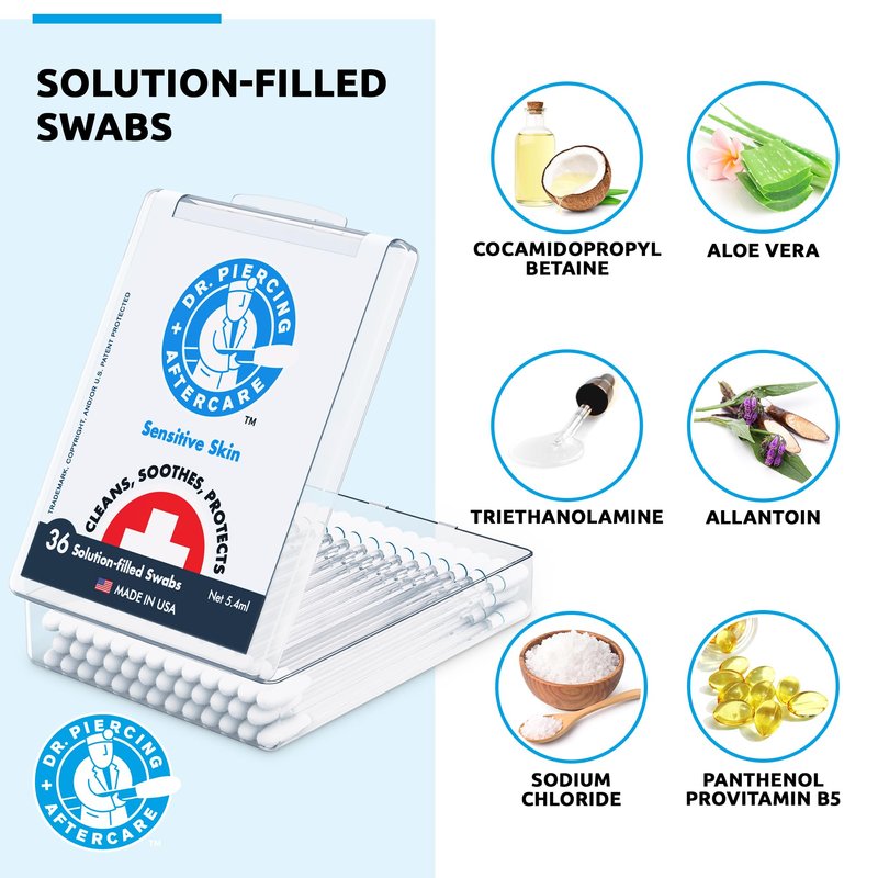 - MAKES AFTERCARE A SNAP - Find the blue line, snap the top, and the wound wash saline solution flows to the swab. Effective as an earring hole cleaner, belly button cleaner, and piercing hole cleaner to cleanse ear & nose bumps, helix, tragus, conch, nipple, and external body piercings.