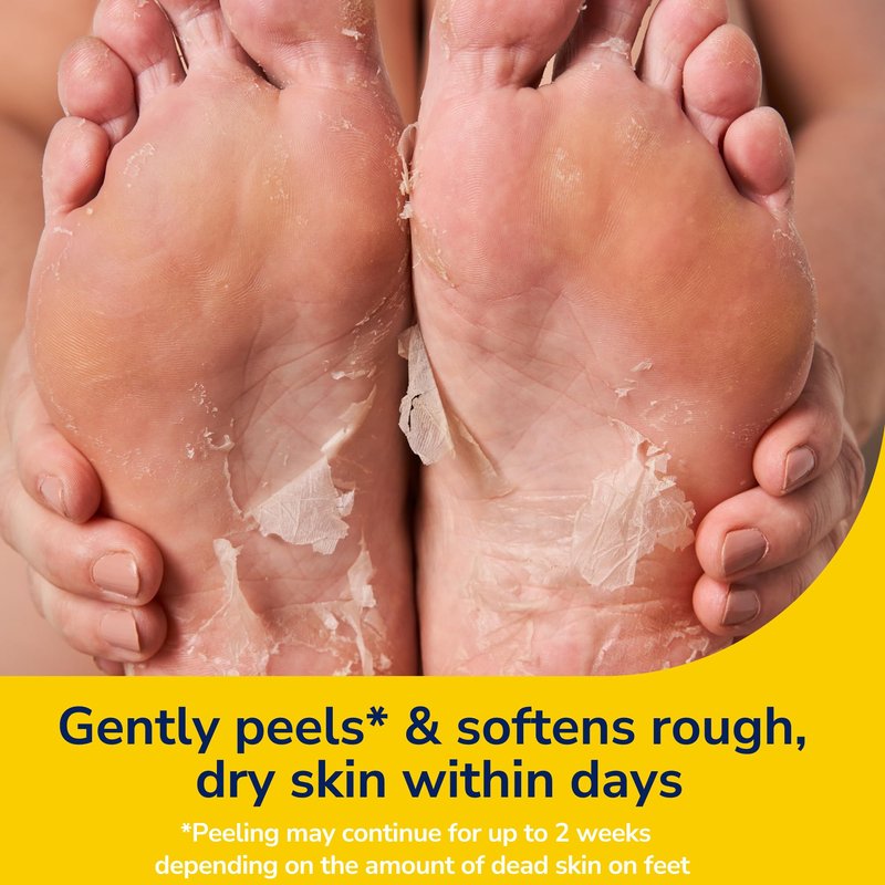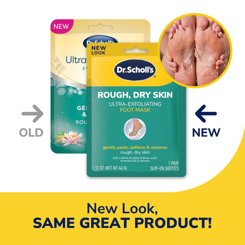 - Peels: Dr. Scholl’s Rough, Dry Skin Ultra-Exfoliating Foot Masks contain an enriched formula which is a proprietary blend of alpha hydroxy complex, urea, and a rich multi-blend of essential oils and natural extracts to help soften, exfoliate, and hydrate rough, dry, flaky skin, leaking leaving skin feeling silky smooth & soft within days