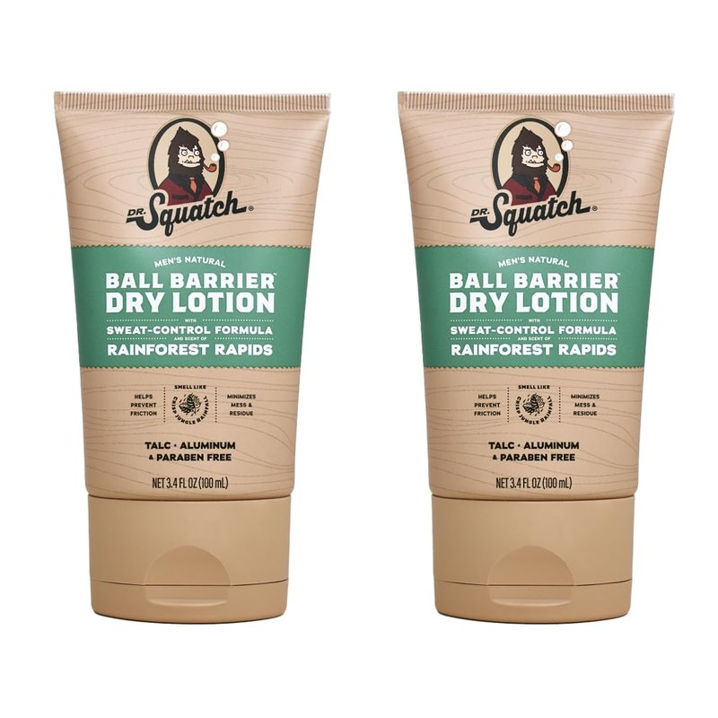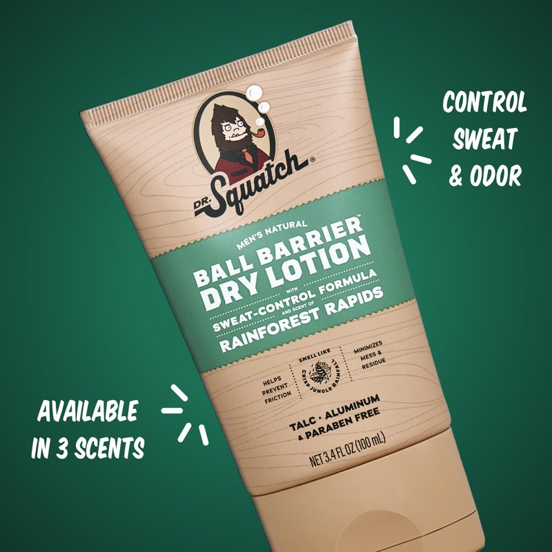 - INNOVATIVE FORMULA - goes on like a lotion and dries instantly into a powder-like feel that helps control sweat, odor and reduce friction. Prep your pair for success and stay fresh all day every day with this 2-pack of Dr. Squatch Ball Barrier Dry Lotion Rainforest Rapids Dry Lotion.