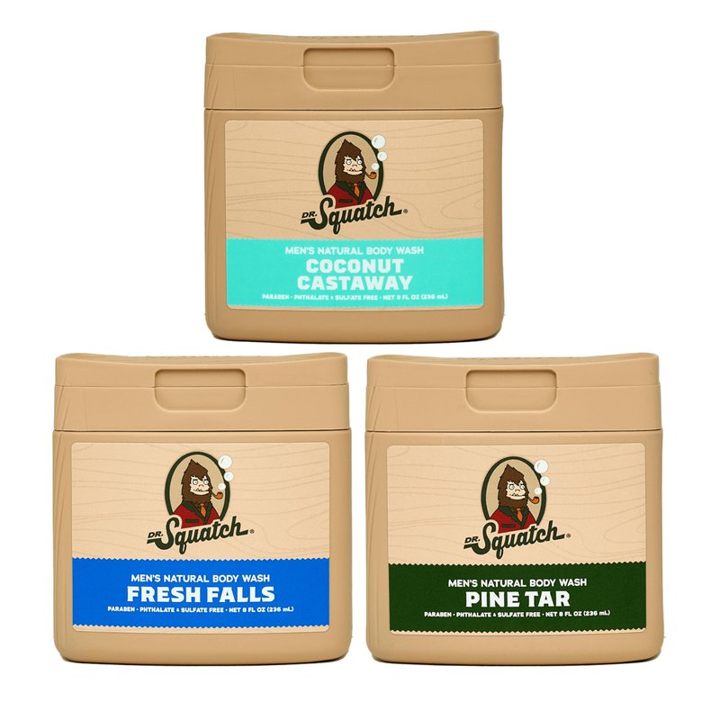 Natural body wash made from real soap, no really – Real Soap! Ditch that synthetic cleanser you call body wash and say hello to the natural liquid soap so epic it’ll instantly become your main squeeze. People have been asking us for years to create a natural body wash and now we finally have a formula worthy of the Dr. Squatch name! Our moisturizing formula cleans deep and is packed with nourishing, natural ingredients like Glycerin and a Coconut-derived cleanser for lavish lathers and satisfying scrubs. Available in four of our most popular unique, manly scents, this formula is free from Sulfates, Parabens, and Phthalates – plus it’s perfect for daily use on all skin types. Scents: Pine Tar - Rugged, woodsy, and strong, just like a Squatch man should be. Coconut Castaway - A tranquil and exotic scent of toasted coconut. Fresh Falls - Refreshing and clean with a hint of citrus.