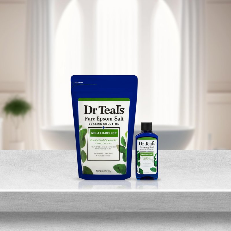 - Dr Teal's Eucalyptus & Spearmint Essential Oils Sampler Set includes two revitalizing bath products: Eucalyptus & Spearmint Essential Oils Epsom Salt and Eucalyptus & Spearmint Essential Oils Foaming Bath.