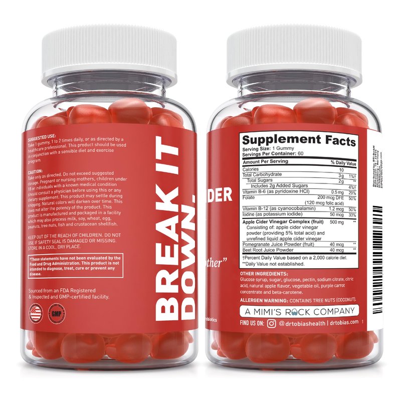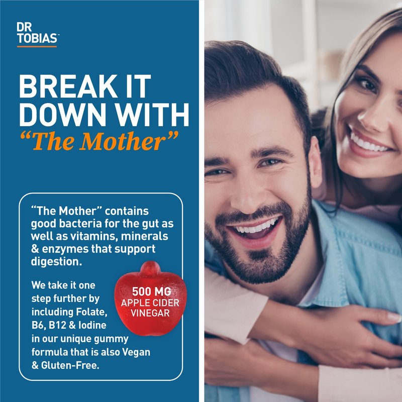 Apple cider vinegar boasts many possible health benefits when it comes to detoxification and digestive support. However, traditional apple cider vinegar tends to have an unpleasant flavor making it less than desirable to take. That's why we've designed Dr. Tobias Apple Cider Vinegar Gummies, so you can reap the health benefits while enjoying the gummy's delicious taste. Our gummies have 500 mg of apple cider vinegar per serving containing "The Mother" in each gummy. The Mother is what contains good bacteria for the gut as well as vitamins, minerals & enzymes that support digestion. We take it one step further by including Folate, B6, B12, and Iodine in our unique gummy formula that is also Vegan & Gluten-Free. We all want to feel our best, reach our goals, live our dreams and love who we see in the mirror. The gut (stomach, intestines, kidney and liver health) is integral to overall health, from metabolism to the immune system. These gummies are a delicious and convenient way to boost your daily health routine. A Better You Starts Here!