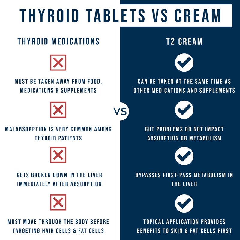 - APPLY ANYWHERE (EASY TO USE & QUICK DISSOLVING) - Research suggests that topical thyroid hormone improves the absorbability and usability of thyroid hormones. By bypassing first-pass metabolism in the liver, this thyroid lotion makes it directly to your cells for maximum support. This route also means you have more flexibility in when you take it as food, supplements, and other compounds do not interfere with absorption. T2 Cream can be applied anywhere but we recommend applying it to the forearm, hips, thighs, or abdomen each day after a shower.