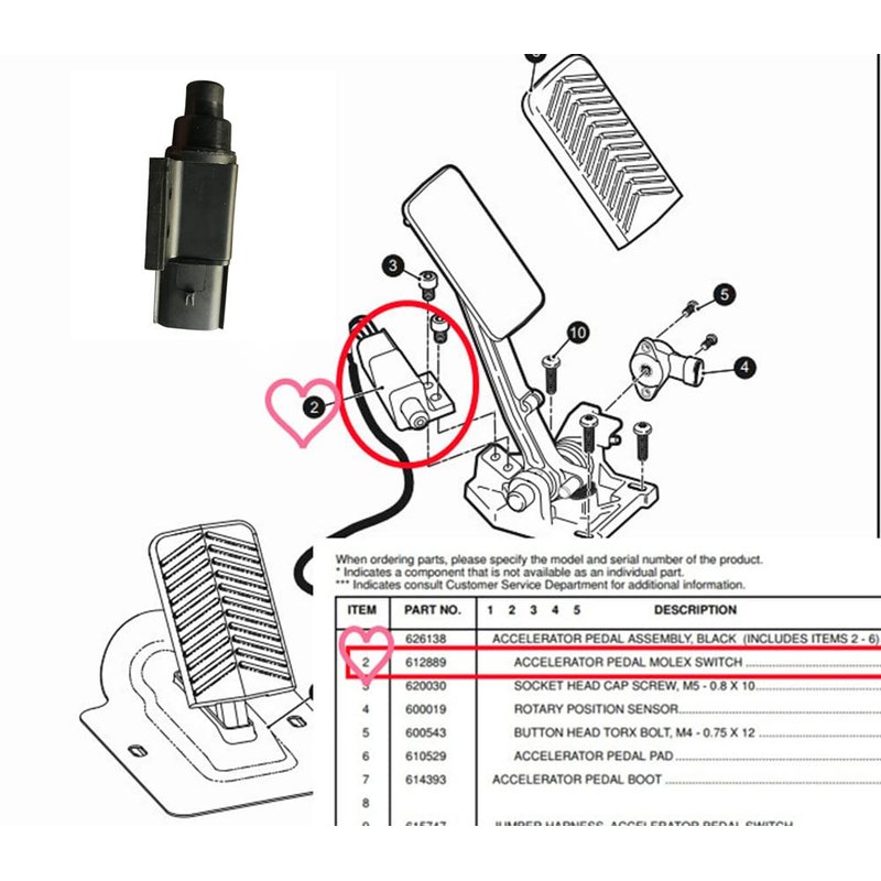 - Golf cart accelerator and brake pedal switch, is a part of accelerator pedal assembly.Replace EZGO RXV Part number: 612889, 609697,Also replace OEM 607605, 430-003, 612889, 575621101, 605538, AM143287, K7621-62251