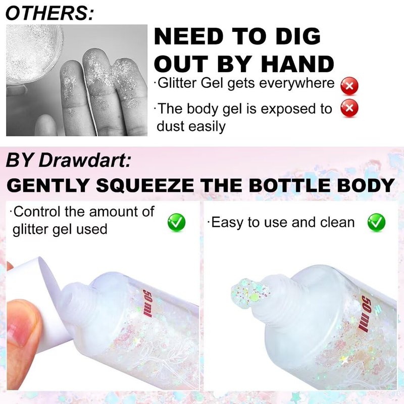 - 【Easy to Use and Remove】:Because face and body glitter gel is sticky, you don't need to use glue when using it, goes on smoothly after easy squeezing out. The glitter can be applied over face paint designs or body shimmer, which removes easily with makeup removal cloths, or a cotton pad with makeup remover.