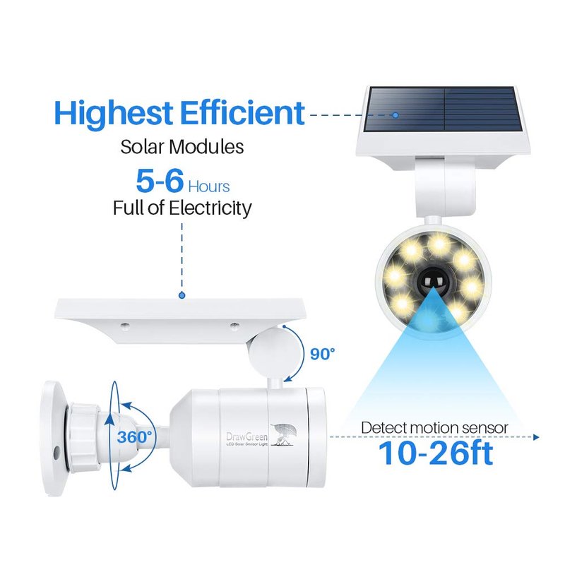 Outdoor solar motion sensor light is apply to outdoor flood security lighting. If you want handy and quickly installed lights for social occasions on your lawn and Garden, Path, Porch, Driveway, Deck, then DrawGreen solar lights is an excellent option. Its advanced solar panel is designed for the most efficient use of solar energy, on sunny day only takes about 5-6 hours to fully charge, Low-light lighting on rainy days without sunlight can last for 3 days, superior to most solar motion light on the market. The lamp holder is adjustable of 360 degrees, built-in PIR motion sensor, can meet a variety of angles of outdoor security lighting.