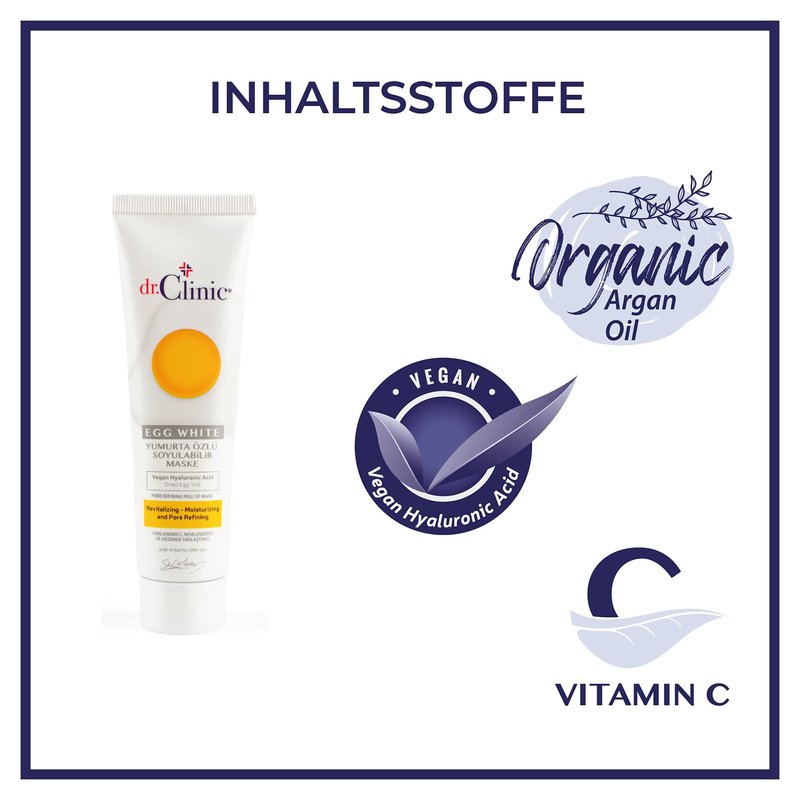- Ingredients: Dr.Clinic Egg White Pore Refining Peel Off Mask cleans, moisturizes and soothes the skin thanks to the Dried Egg Yolk and Hyaluronic Acid in it. Vitamin C provides nutrition to the skin. With regular use, you can have a moisturized, vibrant and blemish-free skin. Suitable for all skin types.