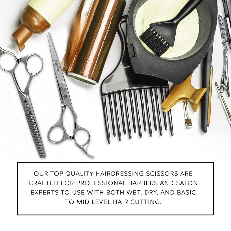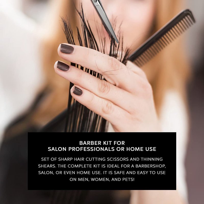 - Our professional-grade barber scissors and Thinning Shears are ideal for a barber shop, salon, or even home use. It is safe and easy to use on men, women, and pets!