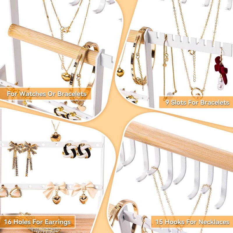 - DECORATIVE JEWELRY STAND: Jewelry tower with white iron frame with bamboo wood structure, you can put it on the dressing table, and it can also be used for jewelry display and sales.