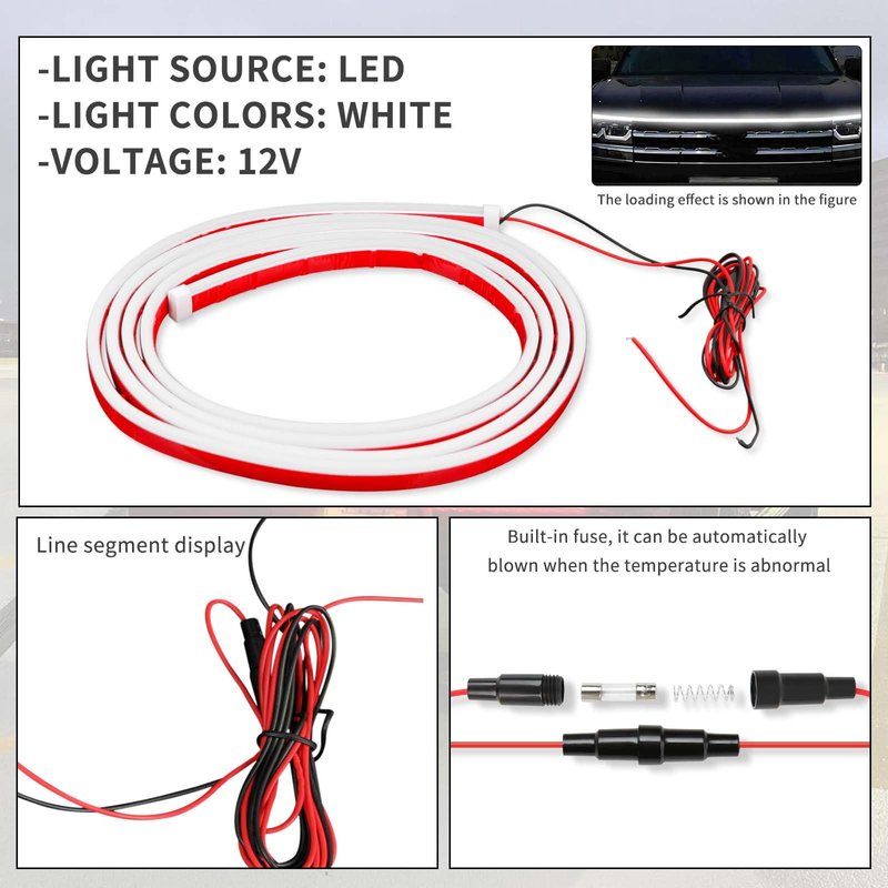 - 𝐇𝐢𝐠𝐡 𝐐𝐮𝐚𝐥𝐢𝐭𝐲 𝐌𝐚𝐭𝐞𝐫𝐢𝐚𝐥 - The car hood LED strip light is made of quality silicone and PVC. Soft and safe, Super brightness. Guaranteeing durability, waterproofing, dustproofing, anti-exposure.