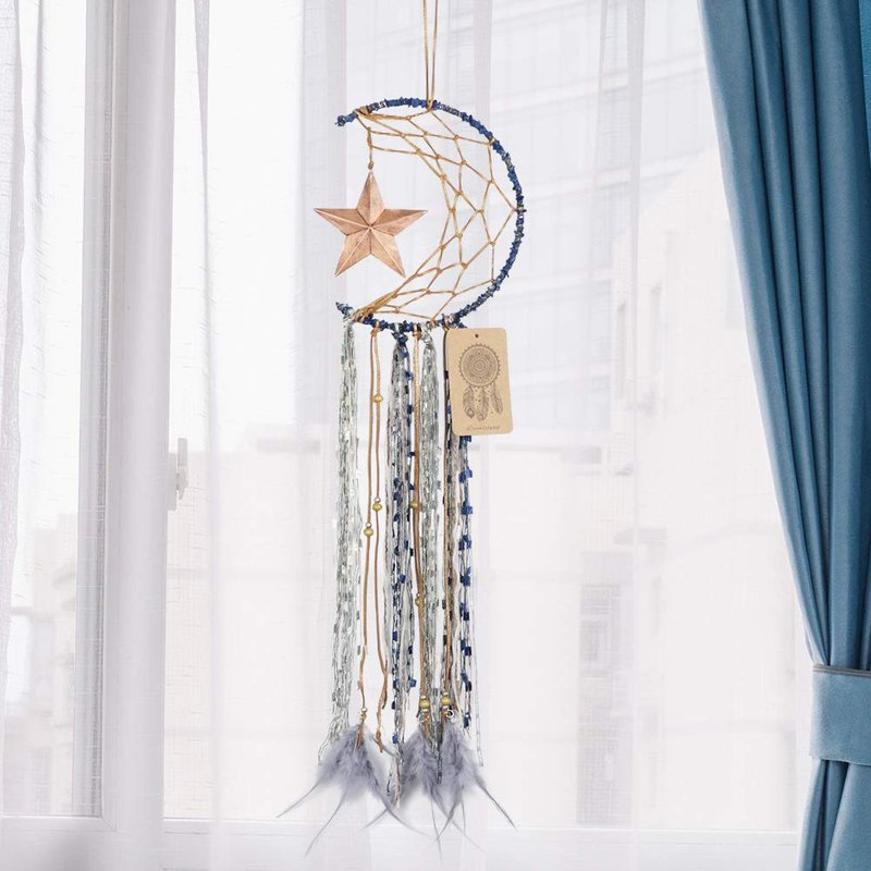 Dremisland Blue Dream Catcher Handmade Half Circle Moon Design Dream Catcher Feather Hanging with Star Home Decoration Ornament Festival Gift (Moon& Star)