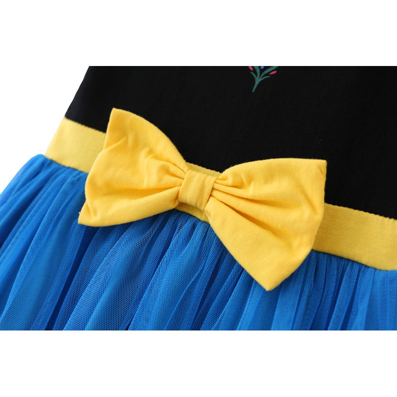 - Short puff sleeve dress with round neckline. Double-layered tulle skirt with yellow beltline and a bow at waist. Printed tulip flowers and snowflake pattern on bodice and skirt.