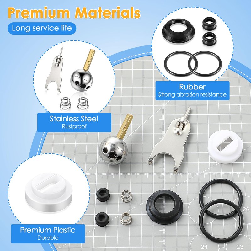 - Package Includes: the kit includes 2 rubber seats, 2 springs (RP4993), 2 O-rings, 1 plastic cam, 1 rubber packing, 1 #212 stainless steel ball, and a wrench