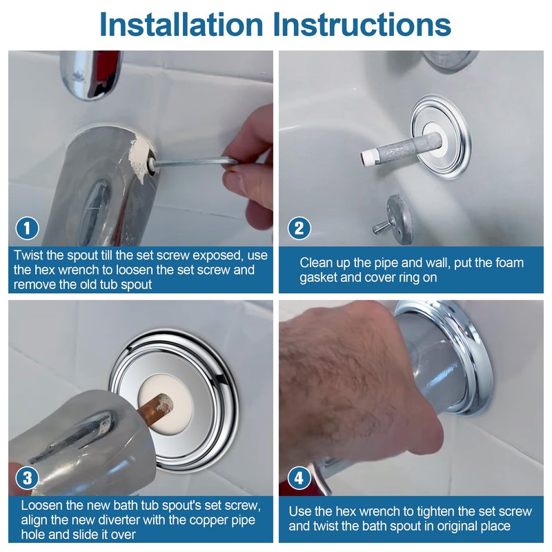 - Easily Install: first, twist the spout till the set screw exposed, use the hex wrench to loosen the set screw and remove the old tub spout; Second, clean up the pipe and wall, put the foam gasket and cover ring on; Third, loosen the new bath tub spout's set screw, align the new diverter with the copper pipe hole and slide it over; Last, use the hex wrench to tighten the set screw and twist the bath spout in original place