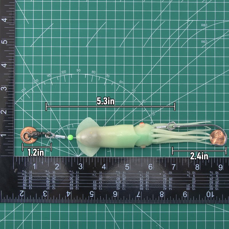 Mold craft squirt squids with highly lifelike appearance, effective lure for TUNA, MARLIN, WAHOO AND OTHER OFFSHORE SPECIES. A tough vinyl body withstands abuse, also features glowing in the dark body plus built in LED light, make them focus under water and all monster fish will chase after them.