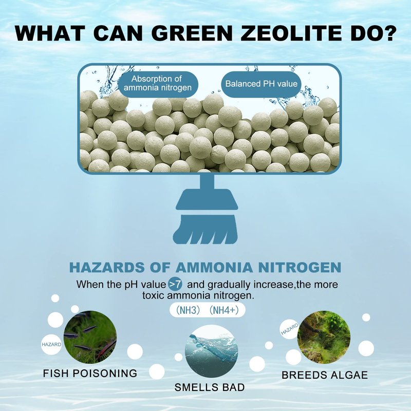 - 🐟【Efficacy of Zeolite】① It can adsorb ammonia, heavy metals and other harmful components in the water. ② Effectively balance the PH value of the water body to achieve a stable water state ③ Zeolite can improve the fertilization efficiency of aquatic plants, make your aquatic plants, nitrifying bacteria grow faster, live more comfortable and more health.