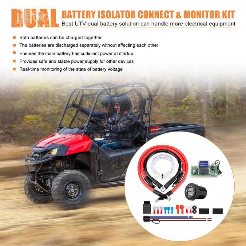 - ULTIMATE DUAL BATTERY MANAGEMENT: This dual battery isolator kit ensures your primary battery is always charged and ready to start your vehicle; It cuts in at 13.4V and cuts out at 12.9V, charging two batteries simultaneously while isolating them when the engine is off, make sure your UTV can always start and optimal charge management for your batteries