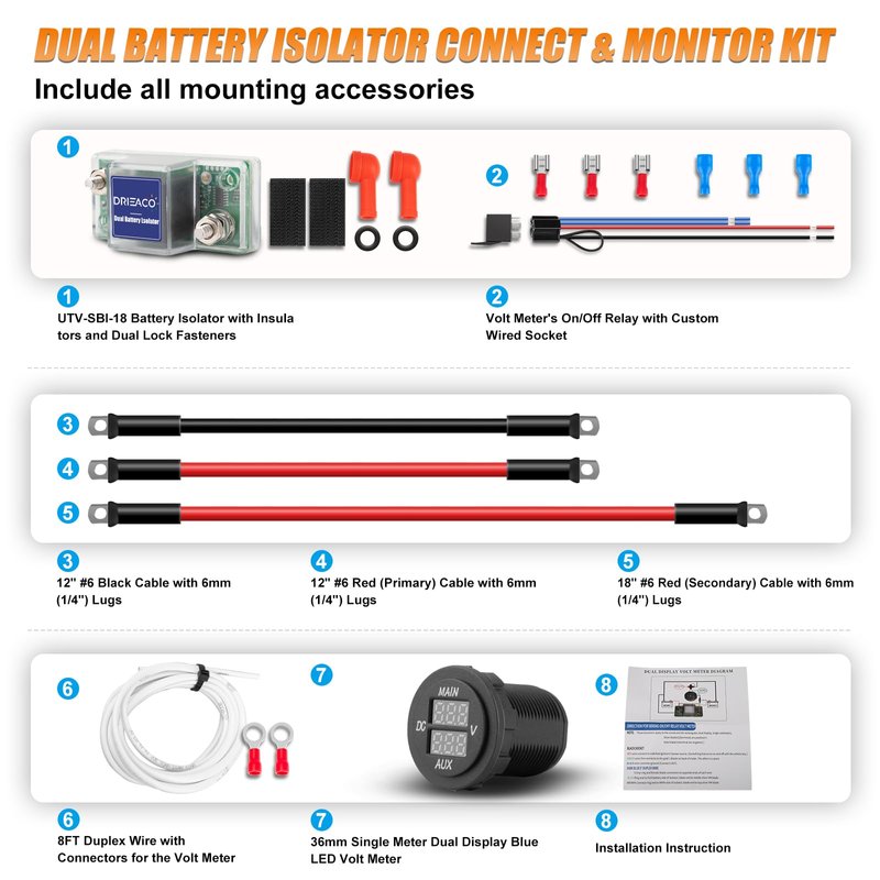 - COMPLETE KIT, EASY TO INSTALL: Battery isolator kit includes everything you need: 1PC UTV-SBI-18 battery isolator, 1PC volt meter's on/off relay with custom wired socket, 1PC 36mm dual display volt meter, 3PCS 6 gauge battery cables with lugs, 8ft duplex wire, mounting hardware, and easy-to-follow installation instructions; Get set up quickly and hassle-free