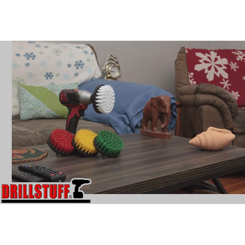 4 piece kit fits all drills and impact drivers. 1/4 inch quick change hex molded-in shaft. The Red brush has stiff bristles for heavy duty scrubbing of flooring, concrete, and brick. The Green and Yellow brush have medium stiffness bristles for all purpose scrubbing of Tile and Grout, Bathroom surfaces, and stairs. The white drill brush attachment has soft bristles for cleaning Glass, Leather, or upholstery. Drill NOT included. Drill Powered four piece Scrub Brush Kit