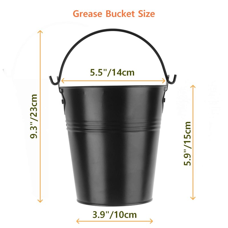 - 【GREASE BUCKET】- Made of high quality materials of durable galvanized steel ,this weather-resistant galvanized steel smoker grease bucket won't rust or absorb outdoors.Size: 5.5in /14cm (W) x 5.9in/15cm (H)