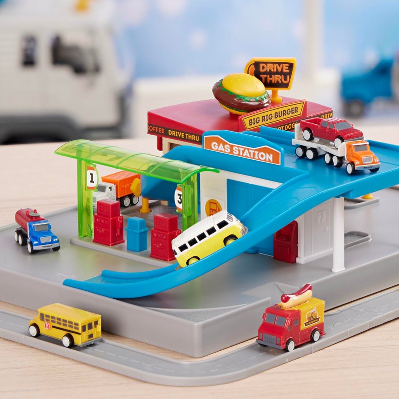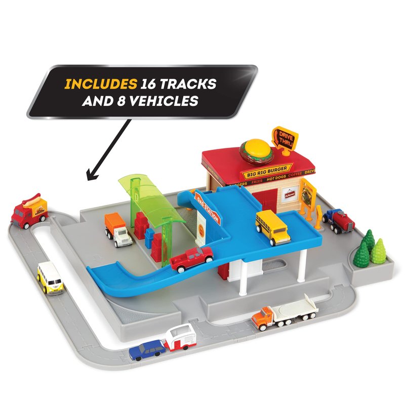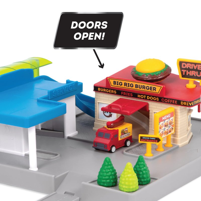 - Drive-Thru Playset: Pocket Series set with toy restaurant, connectible tracks, and realistic vehicles!