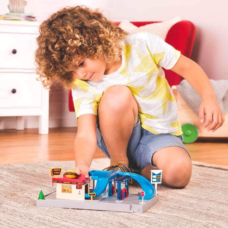 - Toy Car Playset: A gas station and drive-thru restaurant-themed playset for kids.