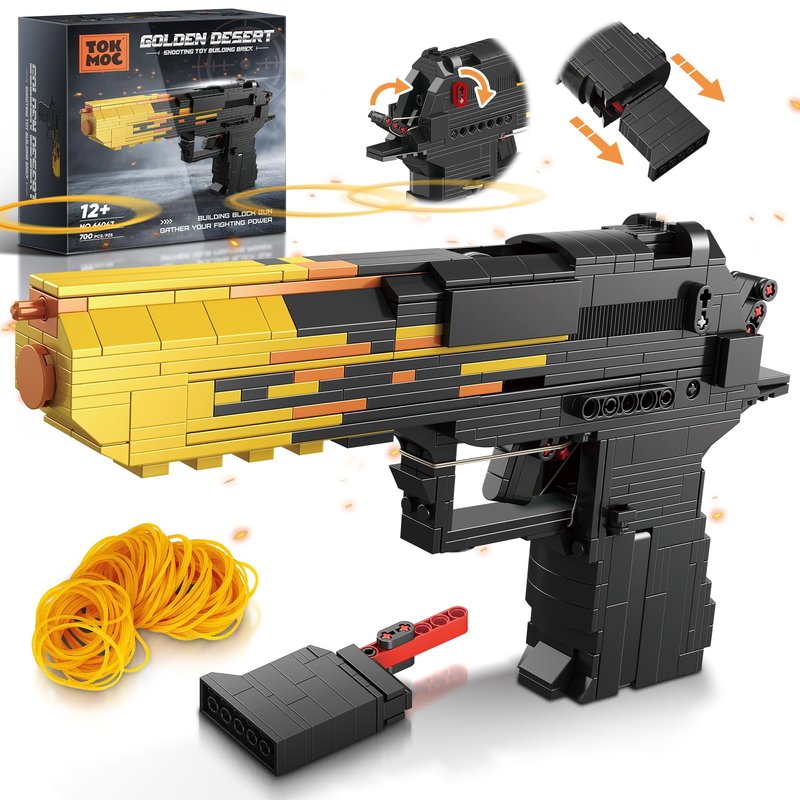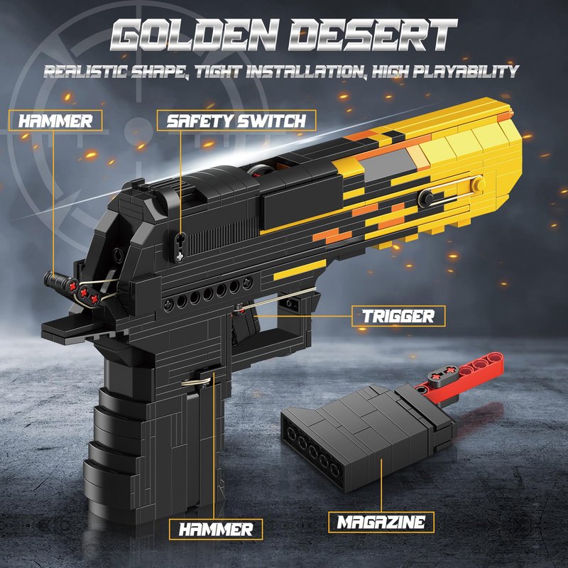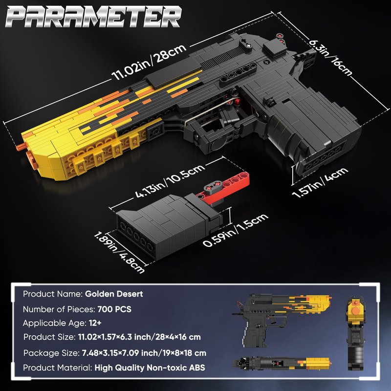 - 【Ideal Gift Option】:This model gun building blocks set is crafted from high-quality non-toxic ABS material, ensuring safety for users. It makes for an excellent gift choice for both kids and adults on a variety of occasions such as birthdays, parties, Halloween, Thanksgiving, Christmas, and Easter. The Golden Desert Eagle design is not only cool and attractive but also comes in a package that is perfect for gifting. With 700 pieces, it offers a challenging yet rewarding building experience that can be enjoyed by all.