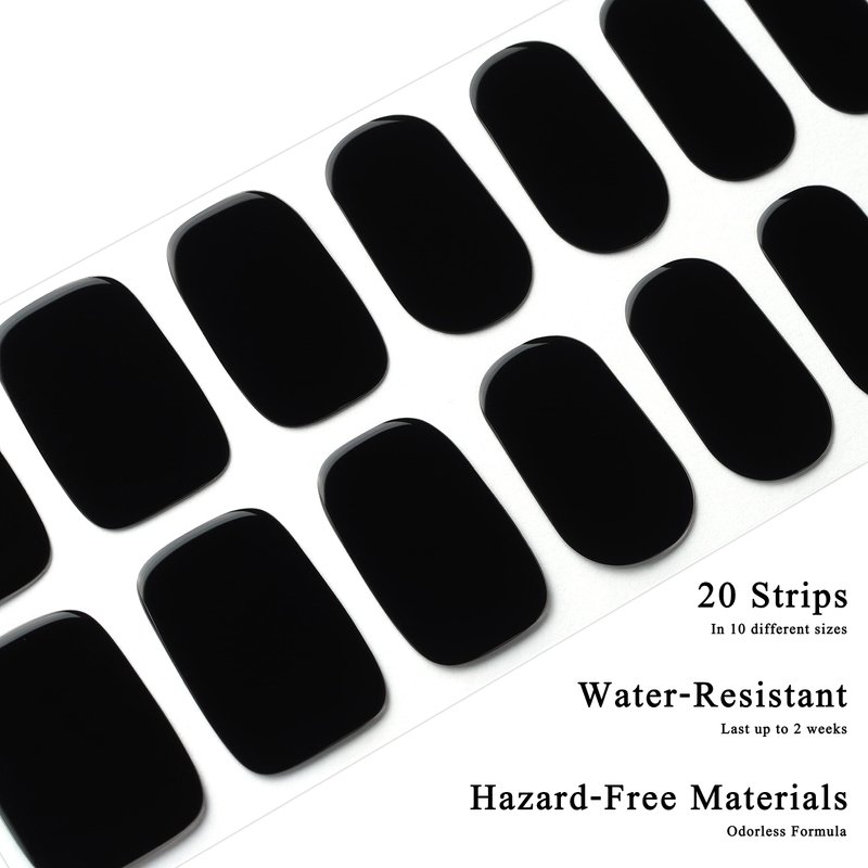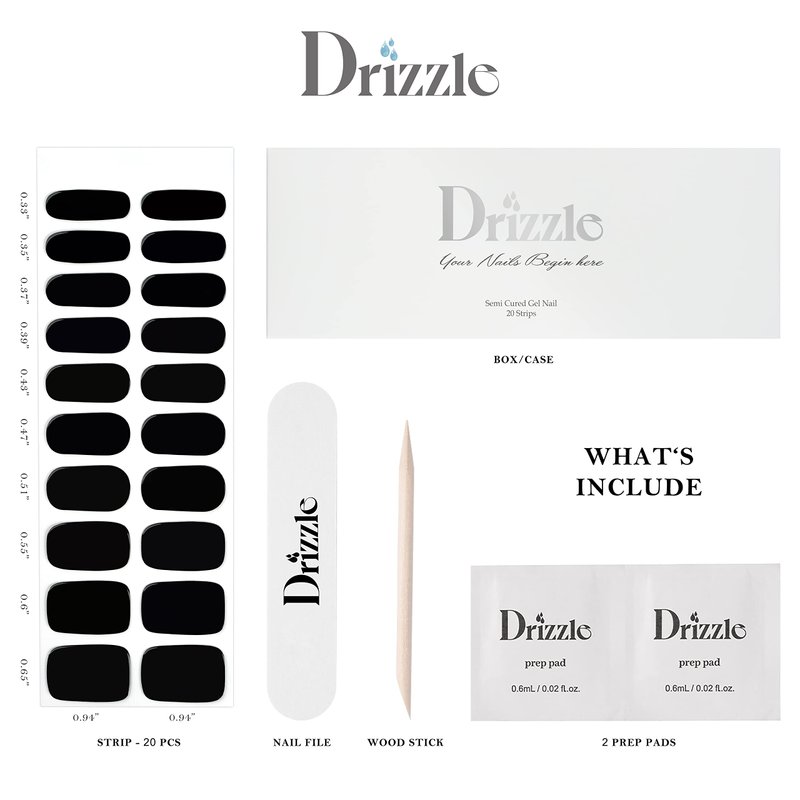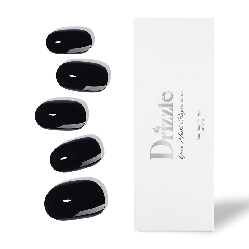Drizzle Semi Cured Gel Nail Strips, Real Nail Polish Art Stickers (UV/LED Light Required), Glossy, Glitter, Solid Color, Full Nail Wraps Long Lasting, Nail Strips Decal for Women (Real Black)