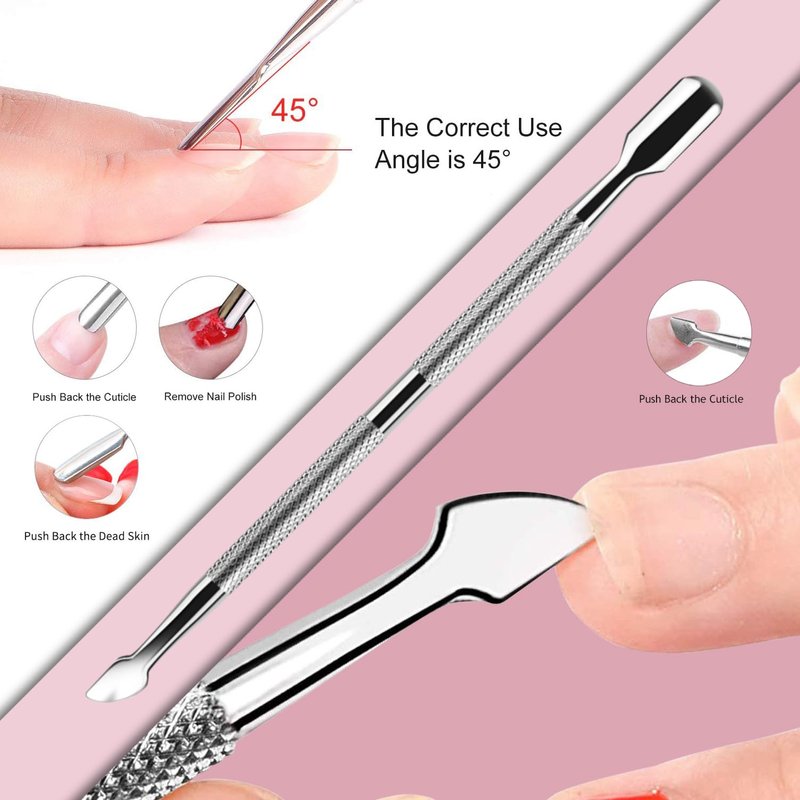 - Pro Cuticle Pusher with 2 Ends: Gently cares for cuticles, enhancing your manicure's finish-Made of stainless steel, the cuticle pusher is comfortable, sharp, and smooth, cleans, scrapes, and pushes with professional ease.Scraping away glue and dirt creates the conditions for a perfect cuticle trim and manicure or pedicure, revealing the natural beauty of the surface.