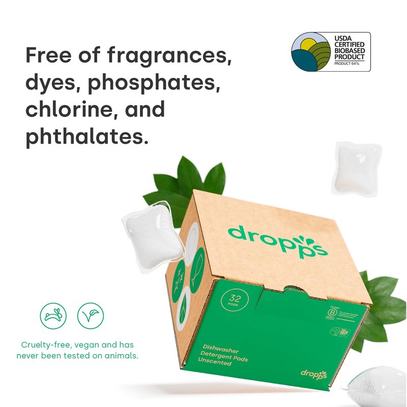 - THOUGHTFULLY FORMULATED: Dropps Dishwasher Detergent Pods feature a 64% USDA Certified BioBased formulation, enriched with advanced enzymes, cleaning agents, and mineral-based ingredients for effectiveness across all wash cycles. Designed to fit all dishwasher types, our compact pods are ideal for any size machine, including compact apartment and European models, ensuring a thorough clean every time.