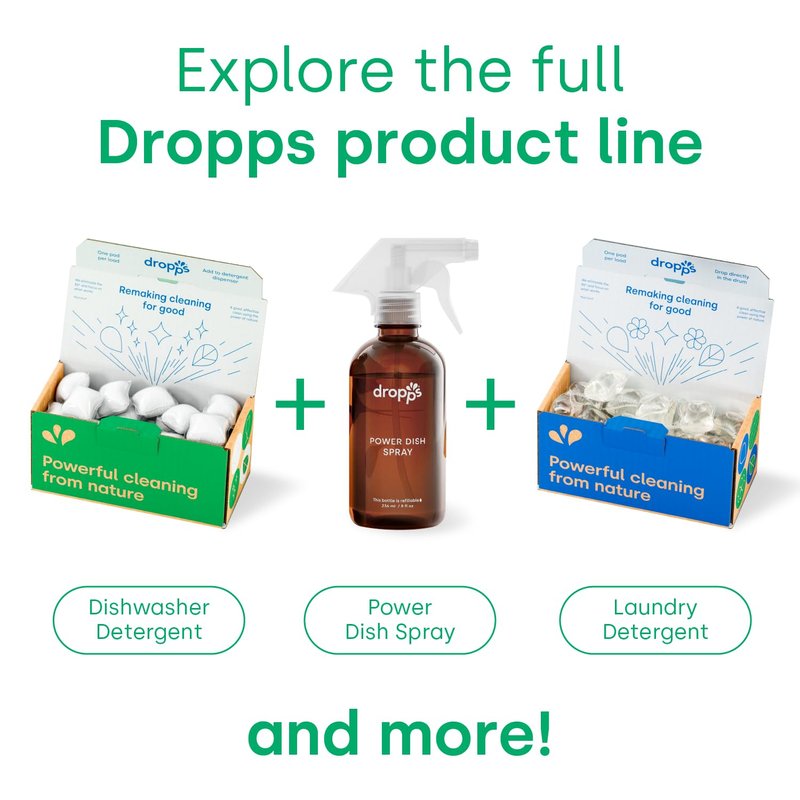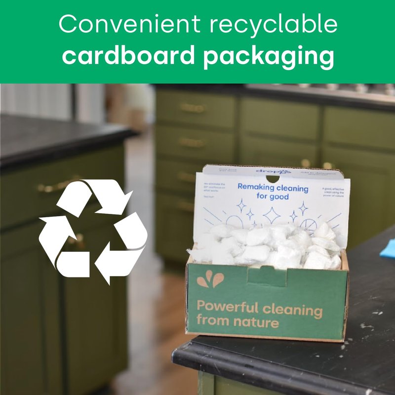 - LOW WASTE PACKAGING: Our recyclable cardboard boxes are a testament to our commitment to smart living. They're designed to be space-efficient, fitting neatly into limited storage areas, ensuring your home stays uncluttered. Trust Dropps for an effective wash, a tidier kitchen, and a package that's considerate of both your living space and broader environmental well-being.