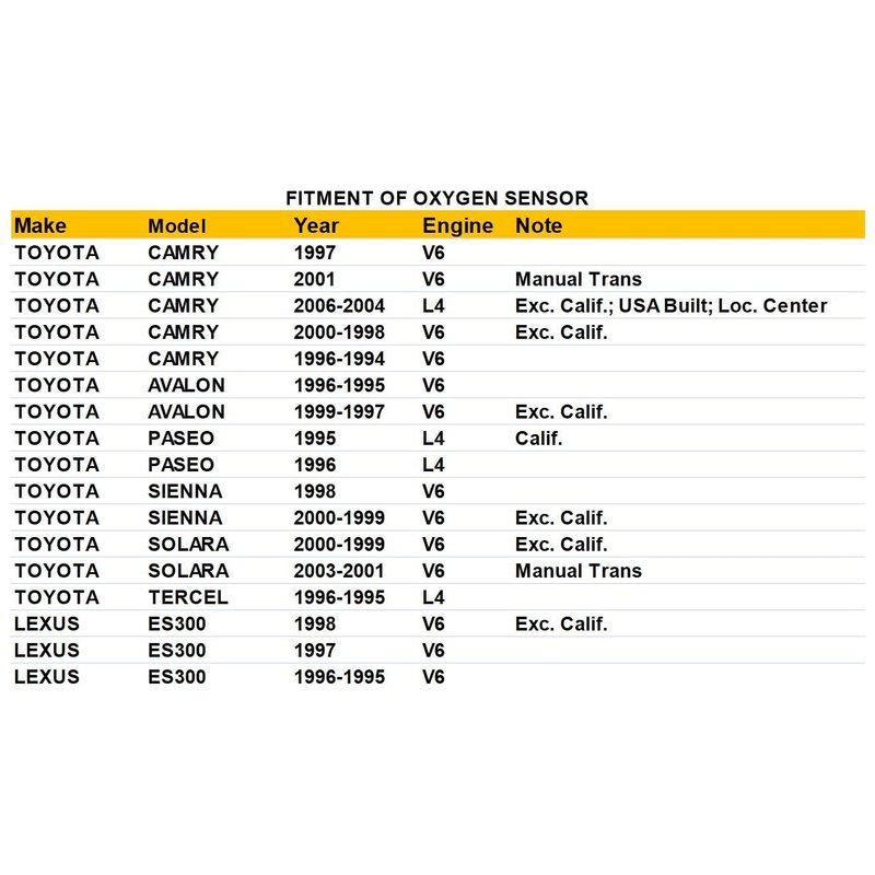 Dropwater bank 1 sensor compatible with toyota camry avalon paseo sienna solara tercel,for lexus 1995-1998 es300 upstream oxygen sensorCompatible with lexusEs300 1997 3lEs300 1998 exc. calif. 3lEs300 1996-1995 3lCompatible with toyotaAvalon 1996-1995 3lAvalon 1999-1997 exc. calif. 3lCamry 1997 3lCamry 2001 manual trans 3lCamry 2006-2004 exc. calif.;usa built;loc. center 2.4lCamry 2000-1998 exc. calif. 3lCamry 1996-1994 3lPaseo 1995 calif. 1.5lPaseo 1996 1.5lSienna 1998 3lSienna 2000-1999 exc. calif. 3lSolara 2003-2001 manual trans 3lSolara 2000-1999 exc. calif. 3lTercel 1996-1995 1.5l