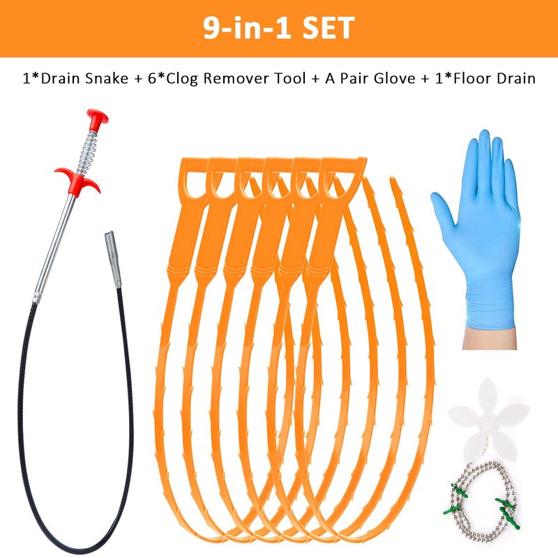 - [9-in-1 SET]: 6 plastic drain hair removal tools, 1 stainless steel drain cleaning tool, a pair of gloves, and a floor drain - we offer you the ultimate combination set. The drain cleaner stick and the hair clog remover tools not only capture solid obstructions but also hook onto hair and debris. Meanwhile, the gloves help keep your hands clean and safe.