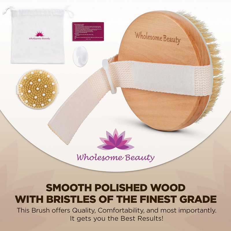 UPDATE YOUR BODY’S SKINCARE RITUAL WITH THE MOST NATURAL & EFFECTIVE ADDITION – THE ULTIMATE DRY BRUSH BY WHOLESOME BEAUTY. With dozens of health and beauty benefits for all skin types, it is no wonder why Dry Brushing is gaining more and more popularity.To enjoy the benefits of this widely-loved technique to the maximum, all you need is a premium dry brush that will work wonders on improving your skin’s texture and radiance.SOFT. NATURAL. EFFECTIVE. UNVEILING THE SMOOTHEST VERSION OF YOUR SKIN NEVER FELT BETTER! Expertly designed to deliver the amazing benefits of dry brushing at the comfort of your home, this exfoliating body brush combines an array of features that renders it the best choice you can make: - 100% NATURAL BRISTLES: A soft, gentle and non-irritating synthesis that even the most sensitive skin types can trust - HIGH QUALITY WOOD HANDLE: Smooth and polished wood that feels great on your hand. Plus, the natural effect would look absolutely stunning on your bathroom - FULLY ADJUSTABLE STRAP: Fits perfectly on hands of any size so you can effortlessly fasten it to your hand for comfortable and uninterrupted brushing - TRAVEL POUCH & STICK-ON HOOK INCLUDED: Great for hanging, storing and even taking the dry brush with you on your travels ONE DRY BRUSH - ENDLESS BENEFITS. SMOOTHER, HEALTHIER, MORE RADIANT SKIN MADE POSSIBLE. * EXFOLIATES SKIN: Removes dead dry skin, clears your clogged pores allowing your skin to breathe * REDUCES CELLULITE: Softens hard fat deposits below the skin while distributing fat deposits more evenly to diminish the appearance of cellulite * STIMULATES YOUR LYMPHATIC SYSTEM: Helps release toxins and boost lymph wellness * INCREASES CIRCULATION: To help eliminate metabolic waste and reduce inflammation ENJOY HEALTHY, BEAUTIFUL, BABY SOFT SKIN, ONE GENTLE BRUSHING AT A TIME. ORDER YOURS TODAY!