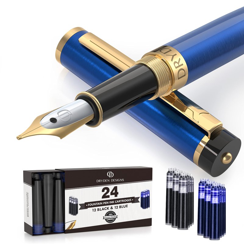 Dryden Designs Fountain Pen - Medium Nib | Includes 24 Ink Cartridges (12 Black 12 Blue) and Ink Refill Converter | Calligraphy Pen, Consistent Writing, Smooth Flow - Blue.