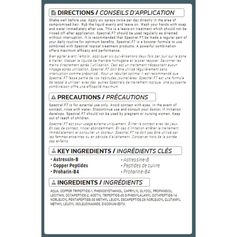 - Spectral.F7 Hair Serum: Spectral.F7 is a novel boosting agent that incorporates Astressin-B, a powerful novel peptide. Our water-based formula avoids leaving an oily or sticky residue and is formulated for both men and women.