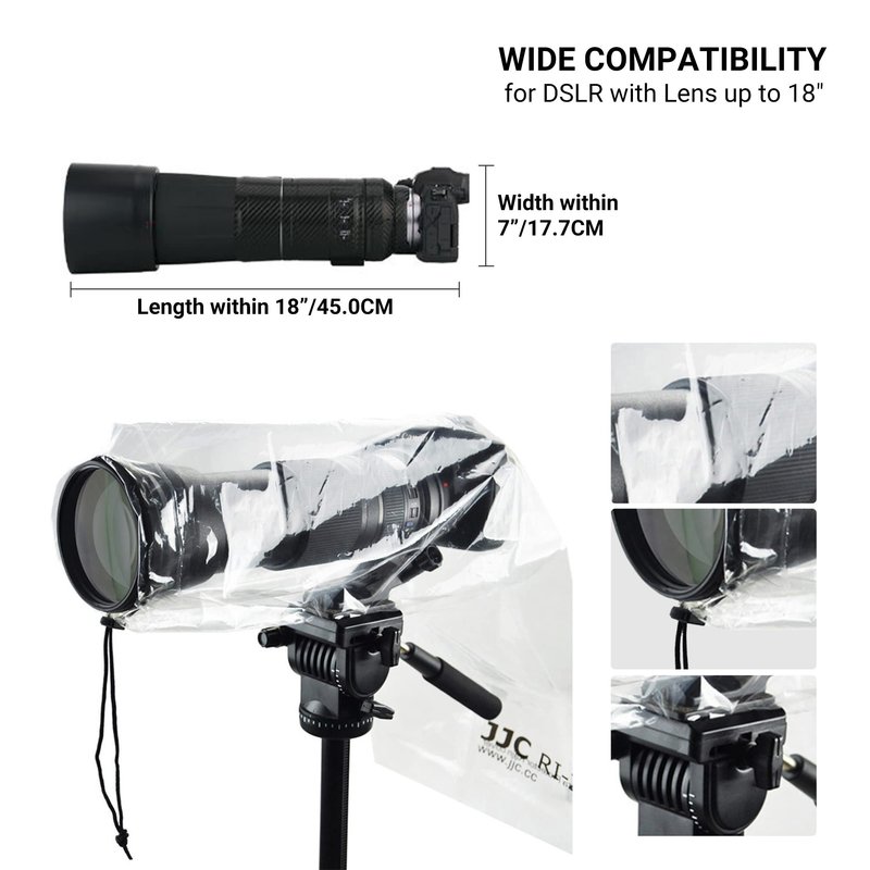 The camera rain cover is suitable for DSLR camera with a lens up to 18"(45cm) long and 7"(17.7cm) wide for Canon, Nikon, Fujifilm, Sony, Tamron, Sigma,etc